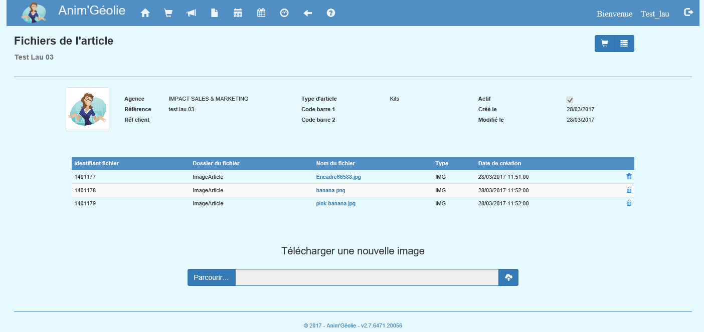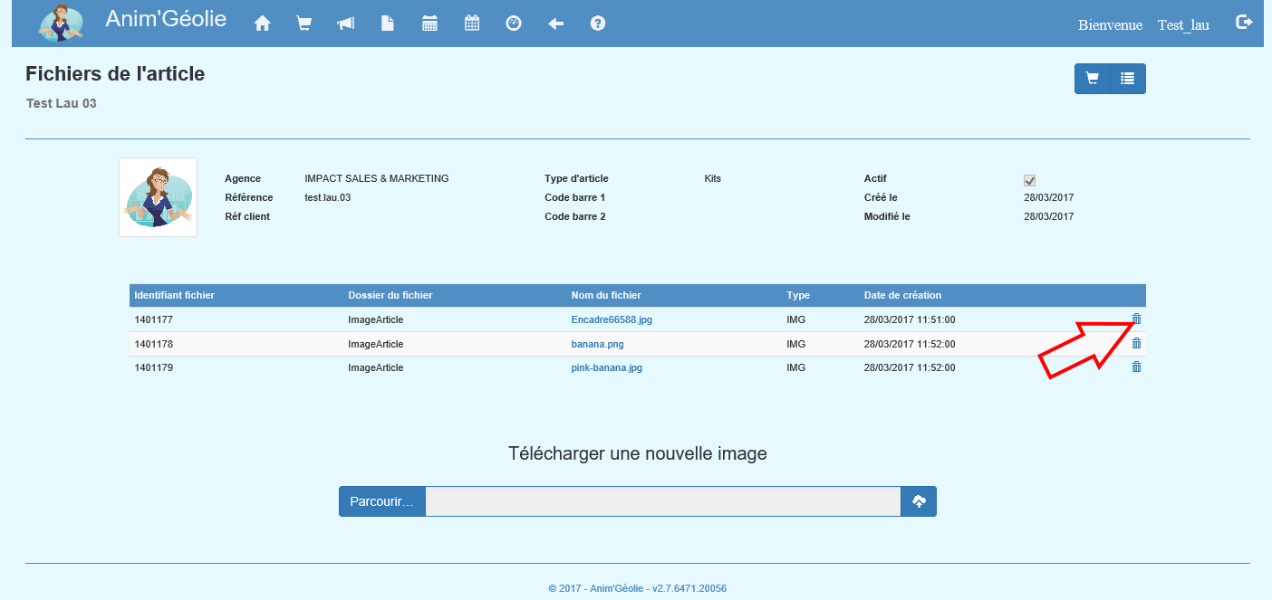 Pour supprimer une image, affichez l'écran de gestion des images et cliquez sur le bouton supprimer sur la ligne désirée :